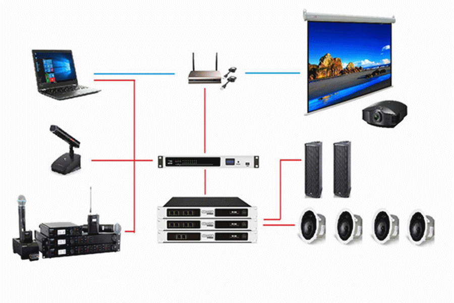 在設計時重點考慮揚聲器的分布以及聲壓覆蓋的均勻,系統的相互信號的交流。會議培訓著重是人聲的重現,語言拾音應選擇曲線平直的話筒。視頻設備根據環境可選用投影、LED屏、LCD拼接屏、會議一體機、電視機,如多畫面顯示,可通過視頻矩陣系統作分配處理。燈光、遠程視頻會議、中控智能、聲學裝飾等更多功能實現根據項目實際需求設計。