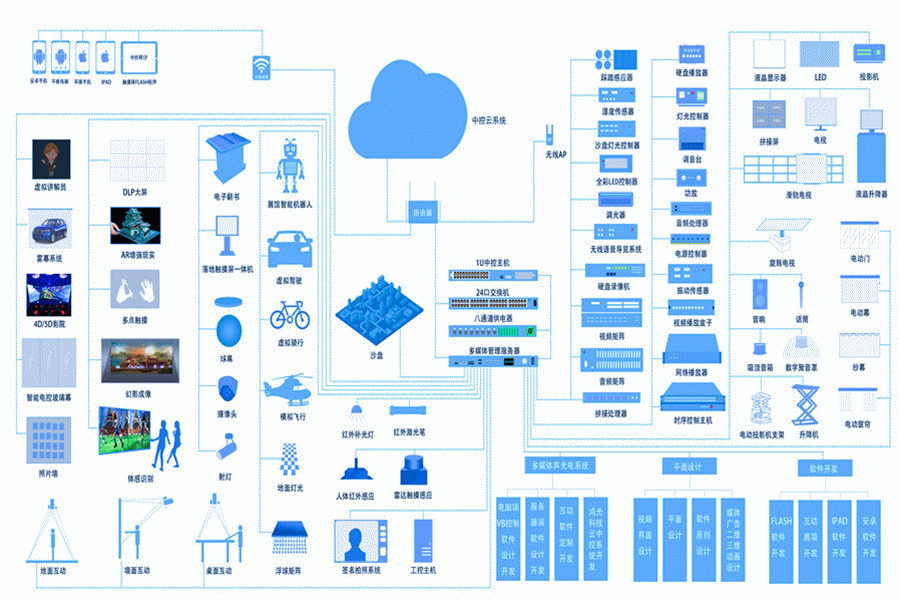 展覽展示系(xi)統(tong)設計應圍(wei)繞(rao)場景應用需求,具(ju)備(bei)擴聲系(xi)統(tong)、多(duo)媒體(ti)顯示、專業氛(fen)圍(wei)燈(deng)光、感應互(hu)動系(xi)統(tong)以(yi)及智能化的(de)集中(zhong)(zhong)控制(zhi)。系(xi)統(tong)設計著重在畫(hua)面(mian)(mian)與(yu)聲音的(de)呈現(xian)上,其中(zhong)(zhong)畫(hua)面(mian)(mian)可(ke)以(yi)通過(guo)LED屏(ping)(ping)、LCD屏(ping)(ping)、櫥窗透明屏(ping)(ping)、滑(hua)軌屏(ping)(ping)、廣(guang)告屏(ping)(ping)、投影(ying)儀等顯示設備(bei)制(zhi)作3D/4D/5D投影(ying)融合、創意電(dian)子(zi)沙盤、虛擬迎(ying)賓、電(dian)子(zi)翻(fan)書、墻/地面(mian)(mian)互(hu)動、虛實動態(tai)、信息查詢系(xi)統(tong)、全息投影(ying)、櫥窗廣(guang)告等等,其中(zhong)(zhong)聲音可(ke)通過(guo)公共(gong)廣(guang)播(bo)系(xi)統(tong)、定向語音播(bo)報(bao)系(xi)統(tong)實現(xian)展區空間的(de)背景音樂氛(fen)圍(wei)、主題播(bo)報(bao)、特定展區的(de)定向語音播(bo)報(bao)。